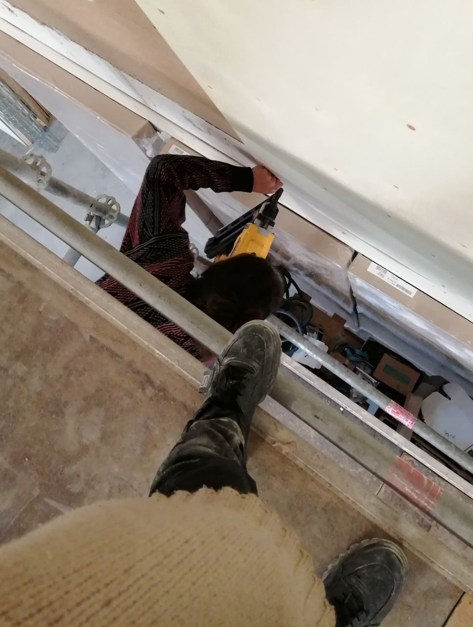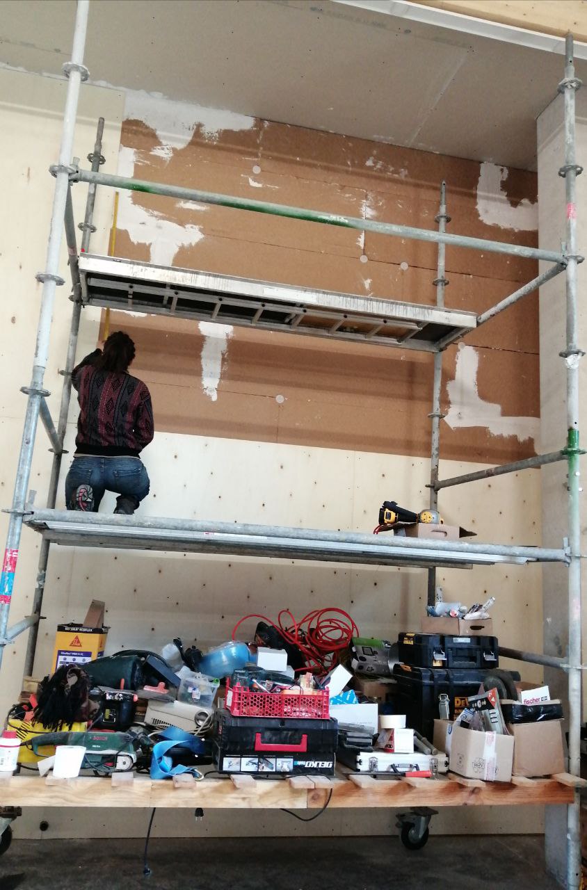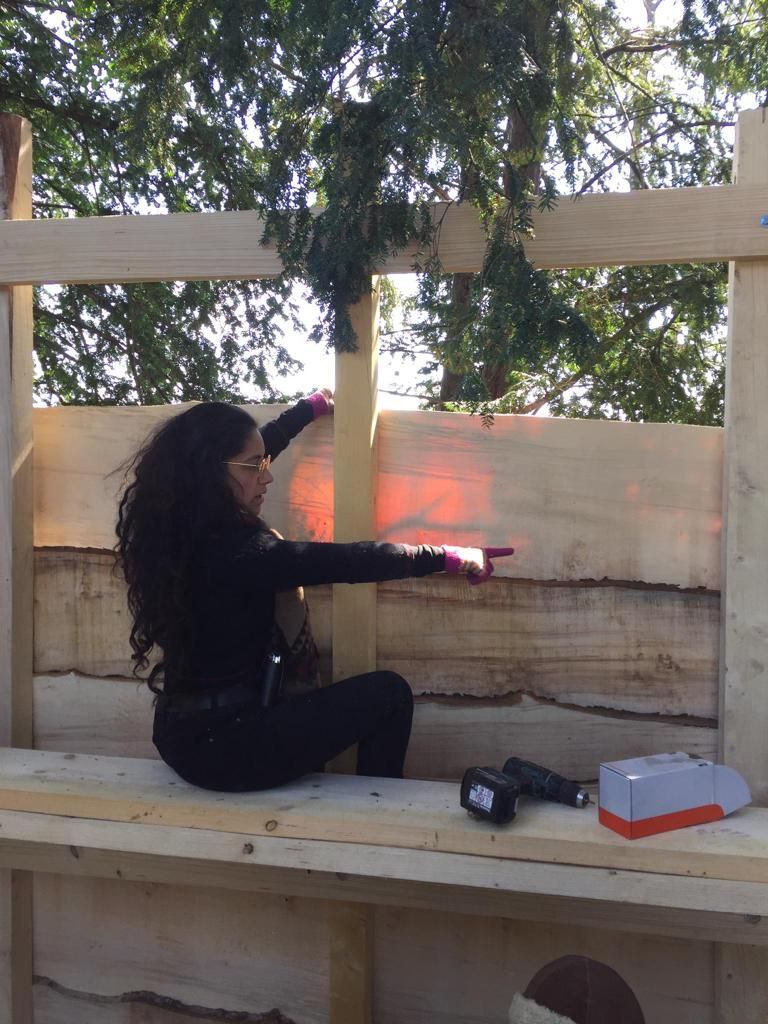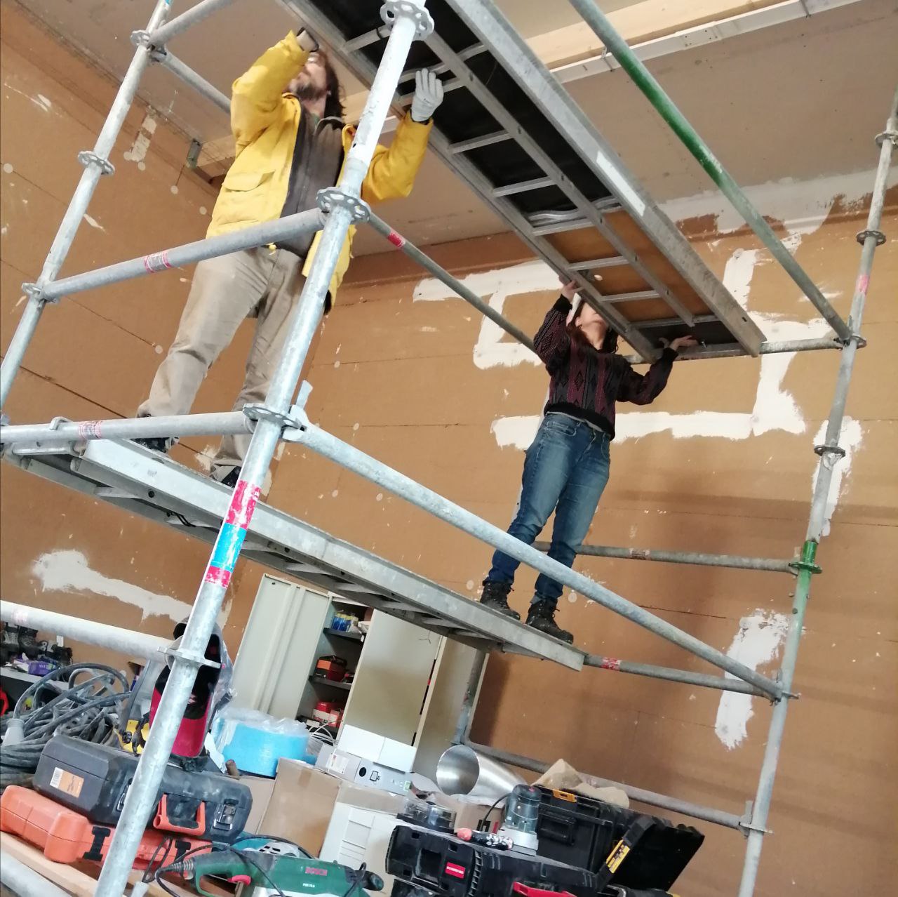 Clouer des revetement muraux en sapin dans l'atelier machine de bermuda avec Maude :)